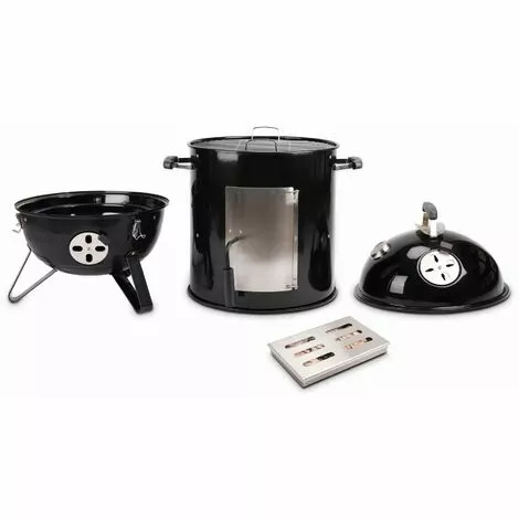 Le barbecue est divisé en 3 : la cuve à charbon pour la chaleur, le compartiment de fumage et le capot. La chambre de fumage se pose sur la cuve. Il y a également 2 grilles de cuissons, et 3 crochets (sur le capot). A vous d’opter soit pour le fumage à plat soit pour le fumage vertical. Les grilles de cuissons peuvent être utilisées en même temps afin de préparer des plats pour plusieurs personnes. Bien sûr, une cuisson traditionnelle de barbecue est également possible, en retirant le récipient avec le liquide pour que les aliments soient en contact direct avec la chaleur.
