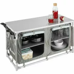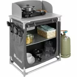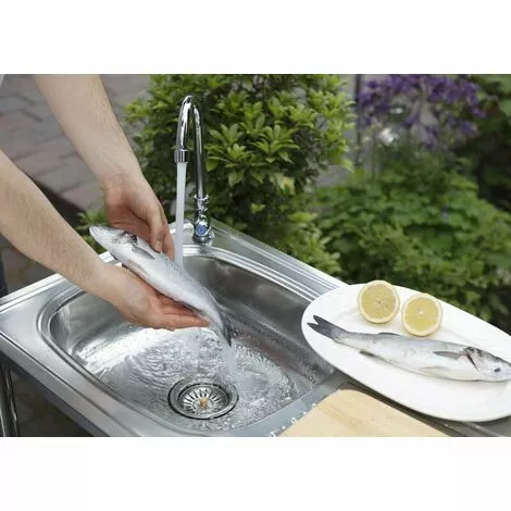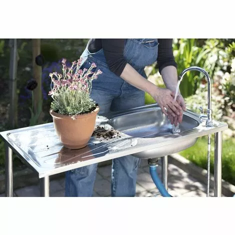 Le lavabo peut être utilisé au camping ou dans le jardin pour nettoyer les outils de jardin. La table est rapide et facile à monter et est livrée avec un tuyau d’évacuation. Pour pouvoir utiliser le robinet, le tuyau d’arrosage peut être branché au robinet et la table est prête à l’emploi.