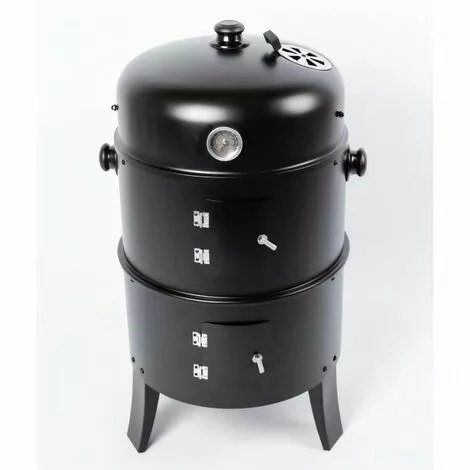 BBQ smoker Cuve diam 39cm Réserve a eau diam 39cm Couvercle diam 44cm Grille de cuisson en acier chromé 39,5cm Grille pour le charbon 33cm Cuve a 2 niveau de 43cm Aeration en acier Inox de 9,5cm