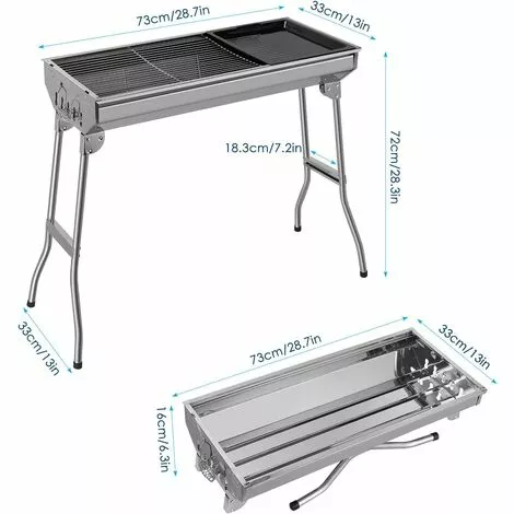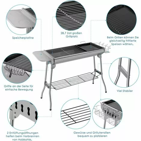 [Excellent matĂ©riau] Le gril Ă charbon est en acier inoxydable 430 de qualitĂ© et ses propriĂ©tĂ©s anti-rouille et anti-dĂ©formation sont bien connues. Il est durable avec une longue durĂ©e de vie. Dans le mĂŞme temps, nos grilles en acier inoxydable ont Ă©tĂ© testĂ©es Ă des tempĂ©ratures extrĂŞmement basses et Ă©levĂ©es. Avec la certification LFGB, sĂ»r et sain, non toxique, vous pouvez faire du barbecue en toute confiance. [Design IngĂ©nieuse] Avec trous de ventilation aux deux extrĂ©mitĂ©s du gril, la circulation de l’air sera plus stable afin que la chaleur soit uniformĂ©ment rĂ©partie sur toute la grille. La conception lĂ©gère du pied pliant facilite le transport et le stockage. La poignĂ©e vous permet de le dĂ©placer de la salle de stockage vers le jardin arrière. Vous pouvez Ă©galement le mettre dans le coffre de la voiture lorsque vous sortez, il deviendra une surprise pour vos activitĂ©s de plein air! [Facile Ă installer et Ă nettoyer] Avec des instructions faciles Ă suivre, le montage devient facile sans outils. Lorsque vous l’utilisez pour griller, si vous mettez une couche de papier d’aluminium sur le gril, il est facile Ă utiliser et Ă nettoyer. [Barbecue d’extĂ©rieur pour 5 Ă 10 personnes] Cette conception de barbecue au charbon de bois permet Ă votre viande de conserver la saveur la plus originale et de rĂ©pondre Ă vos besoins en viande fumĂ©e et grillĂ©e. Rassemblez-vous avec tous vos amis ou membres de la famille et profitez de cette romance unique sur la terrasse, le jardin, le parc, la plage, la cuisine, le pique-nique, le camping en plein air et dĂ©gustez de dĂ©licieux plats Ă tout moment et en tout lieu! [Outils de barbecue inclus] En plus du gril en acier inoxydable, il comprend Ă©galement deux mailles en carbone Ă©paissies, deux grilles en acier inoxydable Ă©paissies, une poĂŞle antiadhĂ©sive, une grille de stockage, un panier de stockage, une plaque de stockage, une pince et une poignĂ©e de gril, presque tous les outils nĂ©cessaires pour un gril parfait.