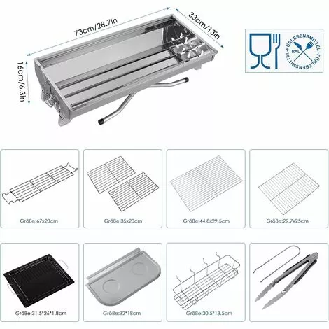 Contenu de la livraison: 2 x grille en acier inoxydable: 29,7 * 25 cm / 44,8 * 29,5 cm 2 x grille de carbone noir: 35 * 20 cm 1 x clip anti-brûlure 1 x panier de rangement: 30,5 * 13,5 cm 1 x plaque de rangement: 32 * 18 cm 1 x étagère de rangement: 67 * 20,5 cm 1 x poêle antiadhésive: 31,5 * 26 * 1,8 cm 1 x clip de grill, longueur: 24cm
