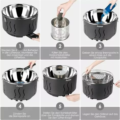 Etapes d’installation 1: insérez 4 piles AA dans le boîtier du ventilateur ou connectez-les au port USB. Assemblez le pot intérieur et la boîte de ventilateur. 2: Remplissez le réservoir de charbon de bois. 3: Mettez un peu d’alcool solide sur la plaque d’allumage en cercle. 4: Allumez l’alcool solide 5: Placez la cartouche de charbon de bois sur la plaque d’allumage et tournez le bouton de la boîte de ventilateur au niveau maximum. 6: Placez le grillage sur le boîtier et fixez-le.