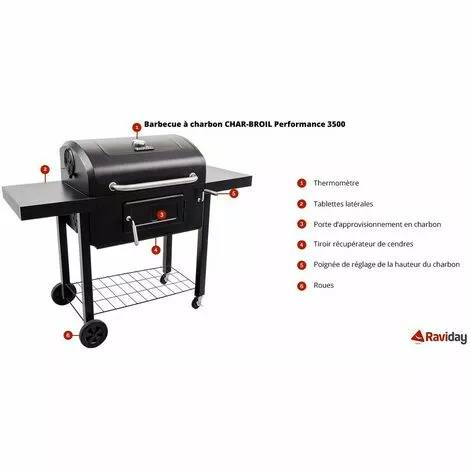Le nouveau système de cuisson du barbecue à charbon Char-Broil utilise un plateau breveté qui facilite le contrôle des températures, en créant une combustion plus efficace et moins de perte de chaleur. Ce système vous permet d’obtenir des résultats de cuisson désirés sans modifier votre expérience de grillade. La chambre de combustion est équipée d’une manivelle externe pour ajuster la hauteur du grill et contrôler plus précisement la cuisson. Un clapet latéral permet de contrôler la circulation de l’air de façon à optimiser les cuissons à haute température sur de longues durées. La cuve et le plateau se retirent facilement pour faciliter le nettoyage. Le modèle 3500 est le plus grand modèle.