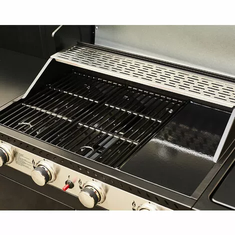 Grille + plancha + réchaud, 4 brûleurs, capot avec thermomètre, zone inférieure avec portes et tablette latérale !