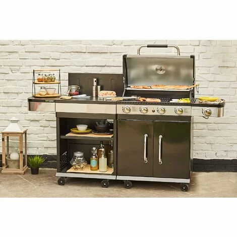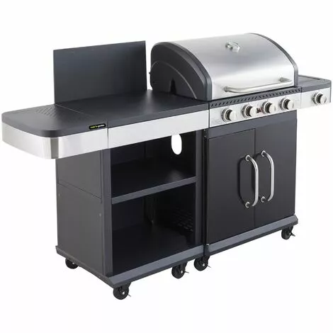 Si vous cherchez des alliés pour cuisiner vos plats de façon rapide et pratique, c’est l’ensemble barbecue FIDGI 4 + sa desserte qu’il vous faut ! Le barbecue au gaz est composé d’une partie « grille » et d’une autre « plancha » pour vous permettre de cuire simultanément vos viandes, légumes ou poissons. Mais ce n’est pas tout : il dispose aussi d’un réchaud latéral pour maintenir vos plats à température et de 4 brûleurs, équipés d’un allumage par piezo intégré pour une puissance de 14,5Kw. Enfin, il possède également un capot avec thermomètre intégré, 4 roues multidirectionnelles et un caisse double porte pour ranger votre bouteille de gaz ou vos accessoires.Quant à la desserte, elle satisfera tout vos besoins grâce à sa grande surface de travail, ses rangements et ses roues multidirectionnelles équipées de freins. Fixez la à votre barbecue et profitez ainsi d’une véritable cuisine d’extérieur, capable de recevoir jusqu’à 10 convives !