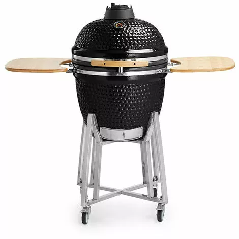 Incontournable en été, le barbecue à charbon est le barbecue préféré des français ! Le barbecue Kamadou, fonctionne comme un four traditionnel. Grâce à son couvercle, il permet une cuisson directe ou indirecte. Les grillades sont ainsi plus savoureuses, et la cuisson mieux maîtrisée. L’extérieur est en inox et l’intérieur en céramique ce qui permet d’accroître la puissance du feu par réflexion et maintient au chaud vos aliments. Il peut être utilisé comme un four, un grill ou un fumoir. Il possède sur les côtés deux tablettes rabattables en bois. La trappe de ventilation et la cheminée permettent un bon réglage du feu. Ce produit est livré avec le grill surélevé, la pierre coupe feu, un thermomètre et la housse de protection. Il fonctionne au bois et au charbon. Dimensions : (Hors tout) 130 x 212 x 73 cm – (Grill) 47 cm de diamètre Poids : 80 kg Livraison sous 10 jours ouvrés