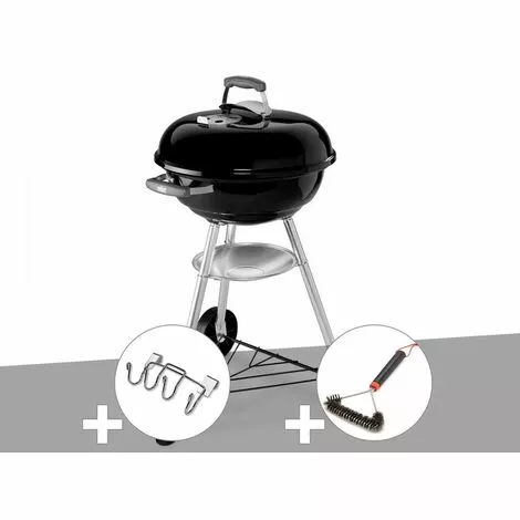 Barbecue charbon Weber Compact Kettle Ø 47 cmPour un hotdog, un hamberger ou des grillades de viande ou de légumes, le barbecue au charbon Compact Kettle de Weber vous aidera à réussir toutes vos recettes de barbecue. Facile à transporter dans le jardin avec ses roulettes et nettoyage simplifié avec son cendrier amovible en aluminium.