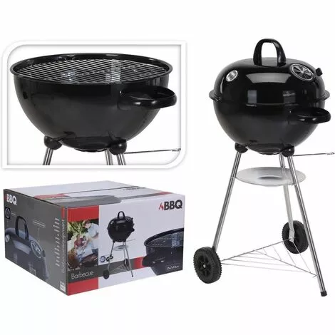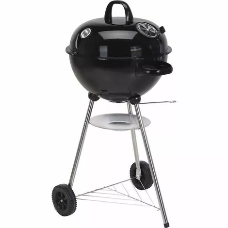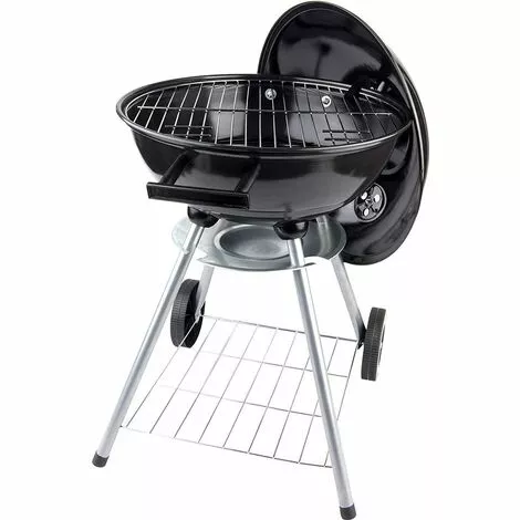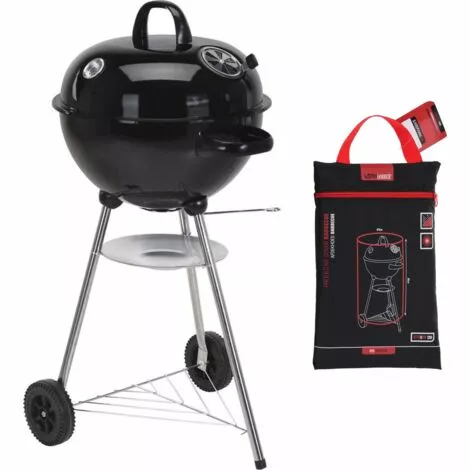 Barbecue rond au charbon de bois avec thermomètre et grille de ventilation dans le couvercle de la marque BBQ Collection dispose de 2 roues, d’une grille de rangement et d’un bac de récupération des cendres.