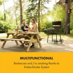 Grâce au bac à eau intégré, la température est mieux équilibrée et les aliments sont plus juteux. La grande porte à l´avant est idéale pour ajouter du charbon de bois, des briquettes ou des chips de fumage.