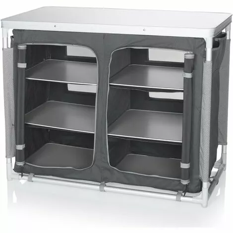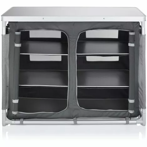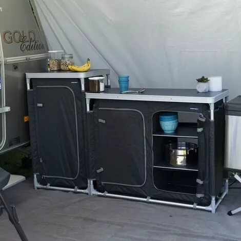 Cette cuisine d’extérieur Madrid de la marque Campart Travel permet de garder tout organisé et à portée de main en camping.
