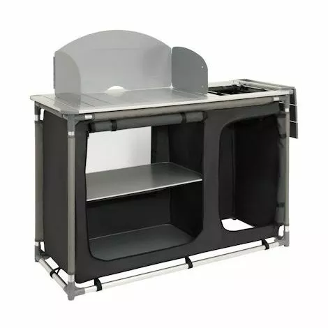 Cuisine de camping robuste avec cadre en aluminium, insert en tissu et étagères en plastique.