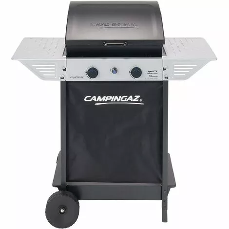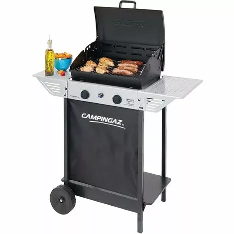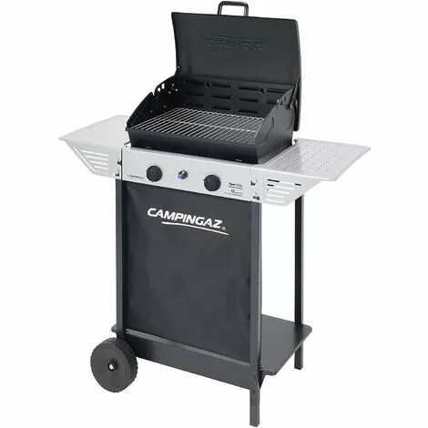 Puissance : 7.100 W – Surface de cuisson : 1.535 cm2 – 2 br�leurs en acier aluminis� – Allumage pi�zo�lectrique – Grille chrom�e – 2 tables lat�rales rabattables avec crochets pour suspendre les accessoires de cuisson – Dessus en acier estamp� – 2 roues – Ecran frontal en tissu