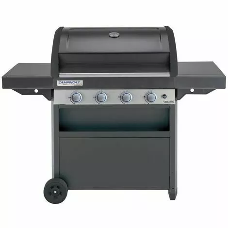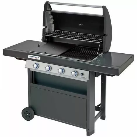 12 a 16 personnes – Grille 50% et Plancha 50% acier double émaillage – 78 x 45 cm – 4 brûleurs inox : 12,8 kW – Grille de mijotage articulée – Cuve se démontable – 2 tablettes rabattables.