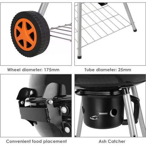 CONCEPTION INGÉNIEUSE: La ventilation chromée facilite l’accélération de la cuisson. Le cendrier barbecue rond au charbon de bois ne laissera pas tomber les cendres et protège votre jardin de la pollution. Avec de grandes roues, vous pouvez déplacer plus facilement le gril à charbon.