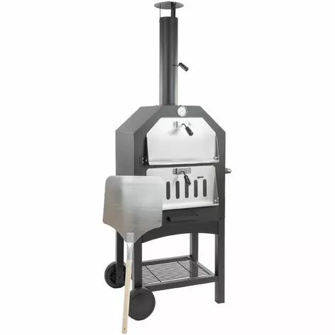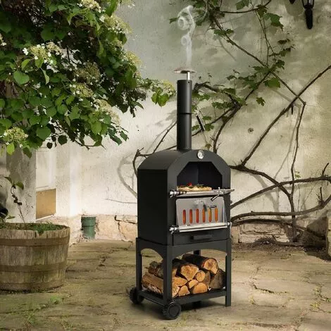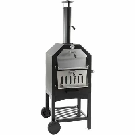 Le four à barbecue/pizza est fabriqué en fer, de couleur noire. Il est facile à déplacer grâce à la poignée installée et aux roues de transport. La fumée est évacuée par la cheminée, elle ne vous dérange donc pas. Le four peut être alimenté avec du bois, des briquettes ou du charbon de bois.
