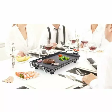 Grille professionnelle très polyvalente, de 26 x 46 cm, adaptée à la viande, au poisson, aux légumes, aux pommes de terre, aux œufs, aux crêpes, etc. 2000W. Comme elle est fabriquée en fonte d’aluminium, elle est beaucoup plus souple que les autres grils. Elle possède un revêtement antiadhésif en Teflon de Dupont qui fait que les aliments ne collent jamais et la plancha est très facile à nettoyer avec du papier absorbant ou dans le lave-vaisselle. Sa parfaite répartition de la chaleur assure une cuisson uniforme. Idéale pour être utilisée comme barbecue, raclette (pour faire fondre le fromage) ou grille japonaise Teppanyaki. Utile dans la cuisine, amusant à table et idéal pour les repas dans le jardin ou sur le balcon. Saine et pauvre en graisses car elle ne nécessite ni huile ni beurre. Il dispose d’un thermostat de précision réglable (jusqu’à 215°C) et d’un témoin lumineux. Les poignées ne brûlent pas. Peut également être utilisé pour la décongélation. 6 spatules et recettes incluses !