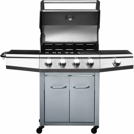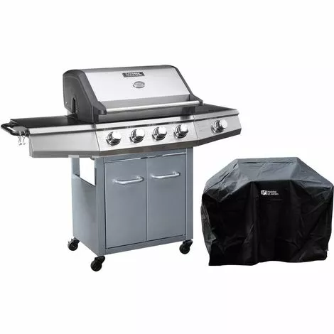 Vous pourrez facilement vous procurer une bouteille de gaz dans un magasin de bricolage ou directement chez un fournisseur de gaz. N’hésitez pas à prendre conseil sur place pour plus d’information. À savoir : vous aurez également besoin d’un détendeur et d’un tuyau à gaz. Ces derniers varient en fonction de la taille de votre bouteille de gaz et de type de gaz choisi. Descriptif : – Barbecue gaz LED 4+1 brûleurs – Une puissance de 15.2 kW – 4 Brûleurs de 11.7 kW et 1 brûleurs latérale de 3.5 kW- Largeur des tablettes latérales : 34 cm – Récupérateur de graisse amovible – 3 Crochets pour suspendre vos ustensiles – Ce modèle est équipé dune tétine gaz. : Vous avez besoin dun tuyau de gaz et dun détendeur conforme, selon votre type de bouteille et de gaz. Ne pas raccorder sur le gaz naturel de ville. Respecter la date de validité inscrite sur le flexible 5 brûleurs indépendants.