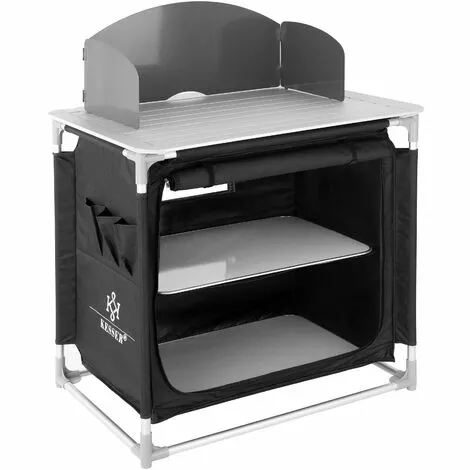 Montable et démontable rapidement, cette cuisine ultra légère se range sans prendre de place. KESSER vous présente sa cuisine de camping solide avec une structure en aluminium, un revêtement en tissu et des étagères en MDF !