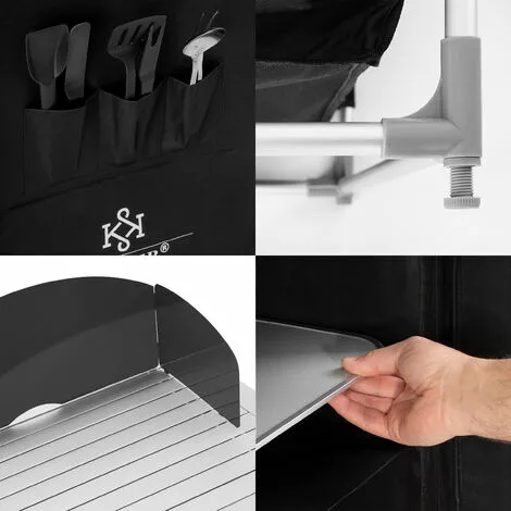 La cuisine de camping de KESSER a beaucoup à offrir dans un espace réduit. La caractéristique principale de cette cuisine en kit ? Ses plans de travail équipés d’une protection pratique contre le vent. En quelques minutes, votre cuisine d’extérieur pliable est montée. La structure robuste en aluminium ainsi que les pieds réglables en hauteur du meuble de cuisine vous garantissent une grande stabilité. Démontée, cette cuisine d’extérieur très légère se transporte facilement dans le sac de transport fourni. Grâce à son sac de transport et à ses dimensions réduites, cette cuisine de camping est le compagnon de voyage idéal.
