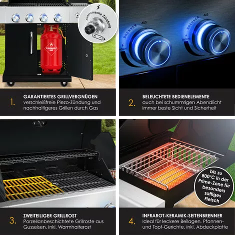 La zone Prime est le point de mire absolu de chaque barbecue et assure une vitesse de cuisson nettement plus rapide – jusqu’à une température de 800 degrés. Viande extra juteuse et croûte croustillante garantie. Tous les brûleurs à gaz peuvent être réglés individuellement et sont équipés d’un éclairage LED moderne qui apporte une touche supplémentaire à votre jardin. Grâce à l’excellente performance des quatre brûleurs principaux, la température de cuisson souhaitée peut être atteinte rapidement. Par rapport aux autres modèles similaires, le gril atteint rapidement la température demandée et fait gagner du temps et de l’argent. En outre, ce barbecue de balcon est équipé d’une grille de maintien au chaud et d’un grand espace de rangement dans le placard pour avoir tous les ustensiles et accessoires nécessaires à portée de main en cas de besoin.