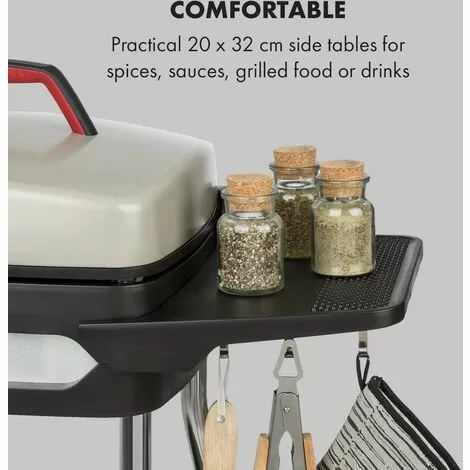 Ce grill électrique doté d’une puissance de chauffe de 2000 watts réglable en continu saura vous séduire tant sous forme d’un grill de table que sur pied, à l’intérieur ou à l’extérieur. Pour pouvoir déguster une délicieuse grillade en plein air, il suffit d’installer le socle avec quatre pieds robustes en acier inoxydable. Pour éviter que les aliments ne brûlent et pour pouvoir nettoyer facilement le grill électrique Gatsby, les grandes plaques de cuisson de 40 x 36 cm en aluminium coulé sous pression sont recouvertes d’un revêtement de haute qualité antiadhésif. La graisse excédentaire est évacuée de la surface de cuisson par un système d’évacuation et tombe dans un récipient de récupération. Afin de pouvoir également préparer du Pulled Pork ou toute autre spécialité au BBQ, le Gatsby est équipé d’un capot en acier inoxydable avec une poignée Cooltouch. Pour encore plus de commodité lors de la cuisson, le grill est équipé de deux tables d’appoint pratiques de 20 x 32 cm. Vous pourrez y placer les épices, les sauces, les aliments, les ustensiles et les boissons. Manique, serviette ou pince de barbecue peuvent bien entendu être suspendues aux trois crochets. Et si vous pensez qu’il n’y a pas encore assez de place, vous pouvez utiliser aussi le grand espace de rangement de 55 x 47 cm situé dans le support, pour y placer, par exemple, des boissons ou des aliments. Grâce aux deux roues, le barbecue peut très facilement être déplacé.