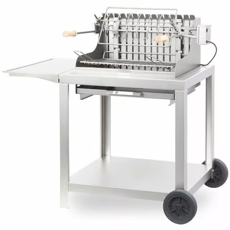 Bénéficiez du Barbecue Mendy et le Chariot de la collection Exclusive de Le Marquier. Alliez fonctionnalité et confort avec le barbecue au charbon de bois qui vous offre une grande surface pour une cuisson horizontale, avec son foyer horizontal et sa grille, et une cuisson verticale efficace, saine avec le foyer vertical, son tournebroche et sa broche anglaise. Un tiroir à cendres et sa cuve composent aussi ce modèle et cette cuve garantit un usage intensif sans déformation (en suivant les consignes d’utilisations). Pour le confort, le chariot est équipé pour faciliter les déplacements et pour optimiser l’espace de travail. La cuve et le tiroir à cendres en inox mat (procédé signé par Le Marquier) permettent une meilleure durabilité en supportant la corrosion, les intempéries, l’air marin et il s’entretient facilement, de même pour le chariot en inox satiné qui permet une résistance à la corrosion, aux intempéries et à l’air marin.