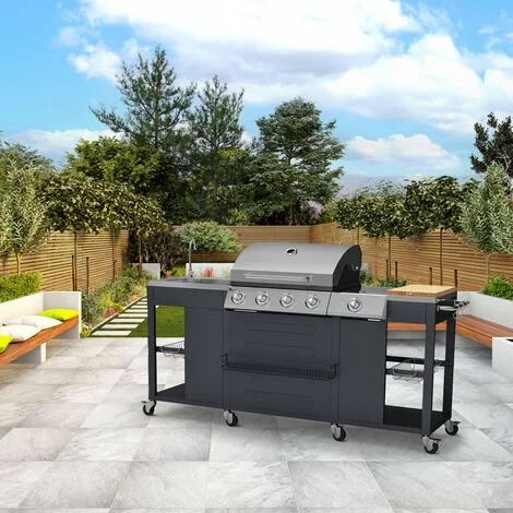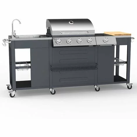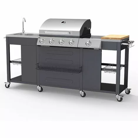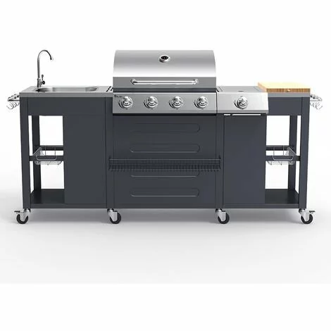 Alimenté au gaz, il est entièrement réalisé en acier inoxydable de haute qualité, en métal et en bois (pour la planche à découper). Facile à nettoyer et à transporter grâce aux 8 roues fournies, TARTARA est le barbecue professionnel dont vous rêviez. C’est une véritable cuisine extérieure complète avec laquelle, grâce aux accessoires fournis, tels que l’évier pratique ou la planche à découper en bois, vous pouvez cuisiner n’importe quel plat en plein air, de la viande au poisson, des brochettes aux hamburgers végétariens ou aux légumes. Avec le barbecue TARTARA, chaque aliment reste savoureux et succulent, tout comme lors de la cuisson sur des braises traditionnelles, de plus il est prêt en seulement 5 minutes et grâce au thermomètre placé sur le couvercle du gril, vous pouvez surveiller en permanence la température des aliments assurant une cuisson optimale de chaque plat. TARTARA est spécialement conçu pour empêcher la fumée de s’échapper ; ce faisant, vous pouvez également utiliser ce barbecue professionnel sur la terrasse ou le balcon de votre maison sans déranger les voisins. Les modèles de barbecue de marque Mr. Tuzza sont fabriqués pour résister aux intempéries, à l’usure et sont soumis à des contrôles stricts avant d’être mis en vente pour assurer au client un produit de haute qualité et toujours garantir une sécurité d’utilisation maximale. TARTARA est le seul barbecue professionnel en vente sur le marché à un prix très compétitif. Mr.Tuzza a pensé à une offre pour tous les budgets !