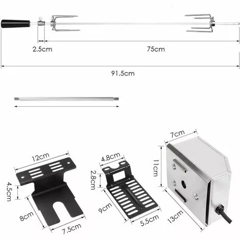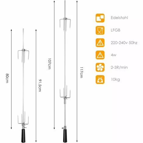 Contenu de la livraison: 1x tournebroche, 2x pince à viande, 1x moteur (220V – 240V), 1x barre d’extension, 1x support pour moteur, 1x manuel.