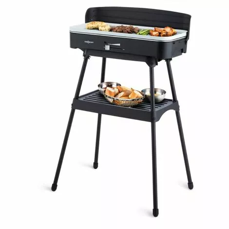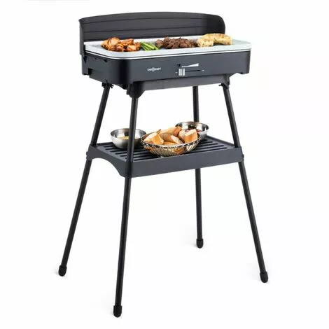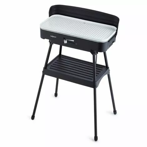 Avec sa puissance chauffante atteignant 2200 W réglables en continu, ce barbecue dispose d’un pied amovible reposant sur quatre robustes piliers. Ce pied est aussi très pratique pour vos grillades en extérieur. Et si vous préférez travailler en cuisine, vous n’avez qu’à retirer la protection contre le vent pour obtenir un grill de table. Pour que rien ne brûle et que le Porterhouse soit facile à nettoyer, la plaque à grillades est d’excellente qualité et dotée d’un revêtement en céramique. Et fixé sur le pied, vous trouverez un rangement très pratique pour les grillades, ustensiles ou autres accessoires utiles. La graisse produite par la viande et le poisson cuits au barbecue est récupérée dans un récipient en plastique facile à nettoyer, et lavable au lave-vaisselle.