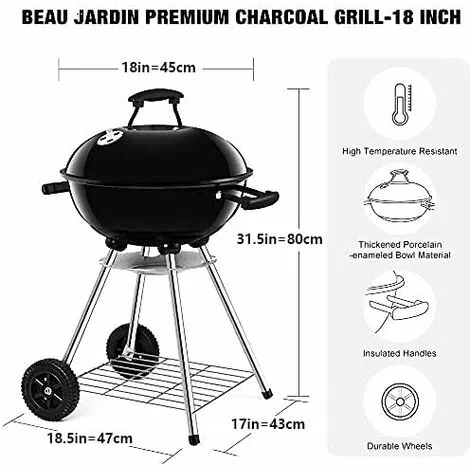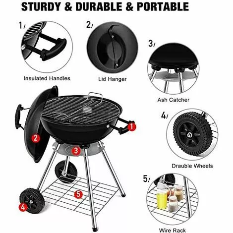 Le cadre robuste et la conception de connexion rendent ce gril durable avec des poignées isolées et des roues durables. Portable pour griller en extérieur avec support de couvercle et cendrier pour un nettoyage facile.
