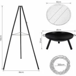 Femor Brasero Exterieur Avec Gril Suspendu, Gril Pivotant Barbecue Avec Brasero, 152cm Trépied Télescopique Et 200 Cm Chaîne Réglable En Hauteur, Ø60cm Brasero Extérieur, Ø52cm Grill