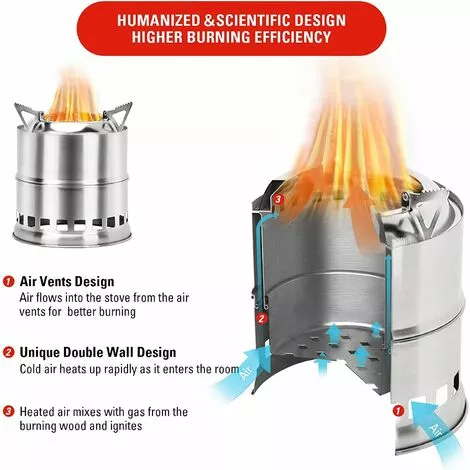 【Une combustion efficace】 le petit poêle a une conception à double paroi, l’air froid se réchauffe rapidement lorsqu’il entre dans la pièce. les trous d’aération permettent à l’air de circuler dans le poêle à partir des bouches d’aération pour une meilleure combustion.