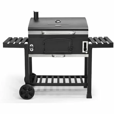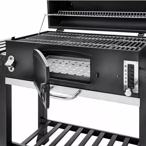 La grille de cuisson (2 pièces) en fonte de haute qualité assure une répartition fiable de la chaleur. Pour un réglage idéal de la température, la cuve à charbon de bois est réglable en hauteur sur 6 niveaux. Vous pouvez lire la température de la chambre de cuisson à l’aide du thermomètre intégré dans le couvercle. Pour un apport d’air optimal, deux soupapes d’aération se trouvent sur les côtés de la chambre de cuisson.
