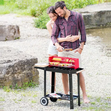 Barbecue, Grill, Smoker, Fumoir, Chariot à 2 Roues + 2 Grilles et 3 Etagères en Acier 86 cm x 34 cm x 80 cm Noir Rouge TECTAKE. • Avec ce barbecue grill, vous êtes paré pour les soirées barbecue, que ce soit dans votre jardin, à la plage ou au camping. • Les deux étagères latérales en bois et celle au sol en métal très pratiques vous permettent de toujours garder vos accessoires à portée de main et de déposer vos grillades dessus. • La grande grille de barbecue offre beaucoup de place pour faire de délicieuses grillades. • Sur la grille chauffe-plat, vous pouvez réchauffer des plats déjà cuits ou l’utiliser pour la cuisson lente de légumes ou de poisson. • Vous pouvez déplacer le barbecue grill où vous voulez grâce à ses deux roues.