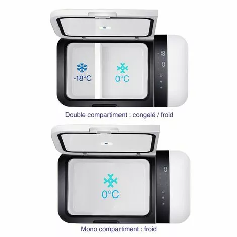 Ce modèle de 20 litres dispose d’un séparateur amovible qui vous permet de diviser le conteneur en deux compartiments : congelé à gauche (>-18°C) et Froid à droite (> 0°C).